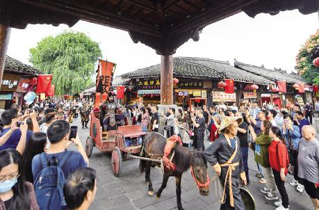 近日,四川省阆中古城景区内人头攒动,游客川流不息。“双节”假期间,阆中古城白天和夜间举行了丰富多彩的文旅活动,汉服巡游、秀才赶考、张飞巡城、道台审案、川北婚俗、亮花鞋等民俗表演,以及嘉陵江灯光秀和《蜀道盛世》《客来阆中》等夜间演出,深受游客喜爱。
