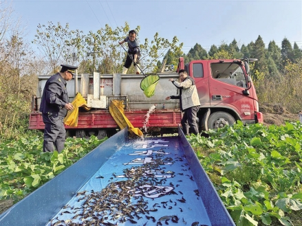 当天,旌阳区农业农村局、区人民法院、区检察院、区公安分局等十个区禁捕工作领导小组成员单位工作人员,来到双东镇凯江大桥东侧河岸边投放鱼苗,一尾尾活蹦乱跳的鱼苗沿着导流槽滑入河中。