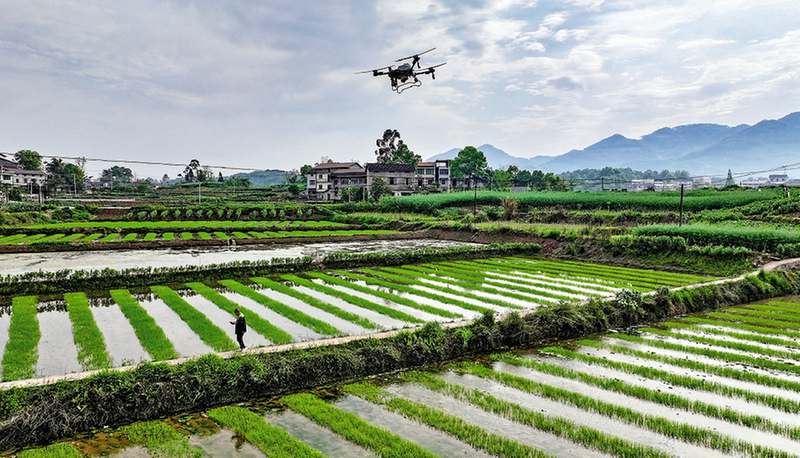 4月9日,四川省广安市盛世农业有限责任公司华蓥市华龙街道沙坝村粮油基地的工作人员,利用无人机给即将移栽的秧苗喷洒杀虫剂。
