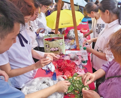 活动伊始,居民们热情高涨,纷纷参与艾草手工香囊和五彩绳的制作。现场弥漫着浓郁的端午气息,一针一线凝聚着大家对传统节日的热爱,一草一饰寄托着对美好生活的期许。这些饱含心意的手工作品随后以1元的价格进行义卖,所得款项将全部用于社区公益事业,既传递了节日温情,也彰显了社区居民的爱心与责任感。