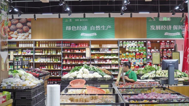 旁边的互民供销超市面积达800余平方米,墙面上装饰着醒目的供销标识和元素,树立了供销社系统的良好形象。超市货架上摆满了日用百货、米面粮油、休闲食品、酒水饮料等各类商品,琳琅满目,应有尽有,最大化满足沿滩居民“一站式”购齐生活快消品的需求。为充分发挥自身的流通优势,超市内还设置了“自然贡品”专柜,售卖当地的农特产品,为农户拓展销售渠道,增加收入,助力乡村产业发展。