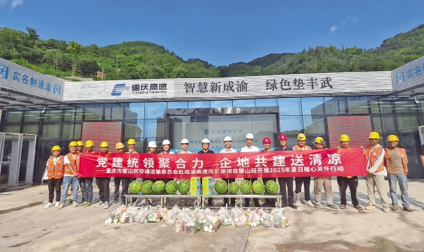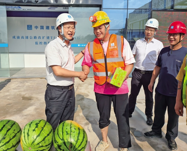 8月12日,重庆市璧山区交通运输委党委书记、主任舒俊带领班子成员一行,前往中建五局成渝高速公路改扩建TJ02合同段项目,开展“党建统领聚合力 企地共建送清凉”慰问关怀活动。中建五局总承包公司市政分公司常务副总经理,成渝高速公路改扩建TJ02合同段项目经理刘海鳌,分部经理龚汉卿等陪同参与。