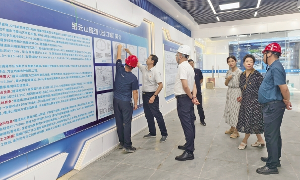 活动中,刘海鳌向到访领导重点介绍了项目关键工程——缙云山隧道的情况。据悉,缙云山隧道出口端采用削竹式洞门,其中左洞出口端线路(K14+185.0~K15+465)长1280米,右洞出口端线路 (Y1K14+207.5~Y1K15+540)长1332.5米。作为低瓦斯大断面长隧道,它具有开挖断面大、软岩占比高、不良地质多、安全风险高、施工工期紧等特点,是全线重点控制性工程。其最大开挖跨度达21.34米,最大开挖高度13.21米,最大开挖断面面积228平方米,为重庆市高速公路首条单洞四车道隧道。