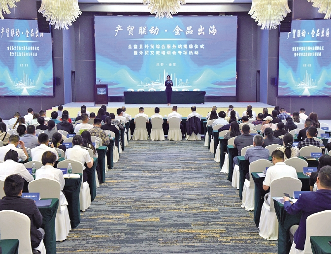 行业部门为企业解读政策 9月22日,在四川省商务厅、成都市商务局的指导下,金堂县外贸综合服务站揭牌仪式暨“产贸联动·金品出海”外贸交流培训会举行,通过搭建政企高效沟通交流平台,帮助企业准确把握外贸政策,增强抗风险能力,进一步开拓国际市场,促进“金堂造”产品出海远航。