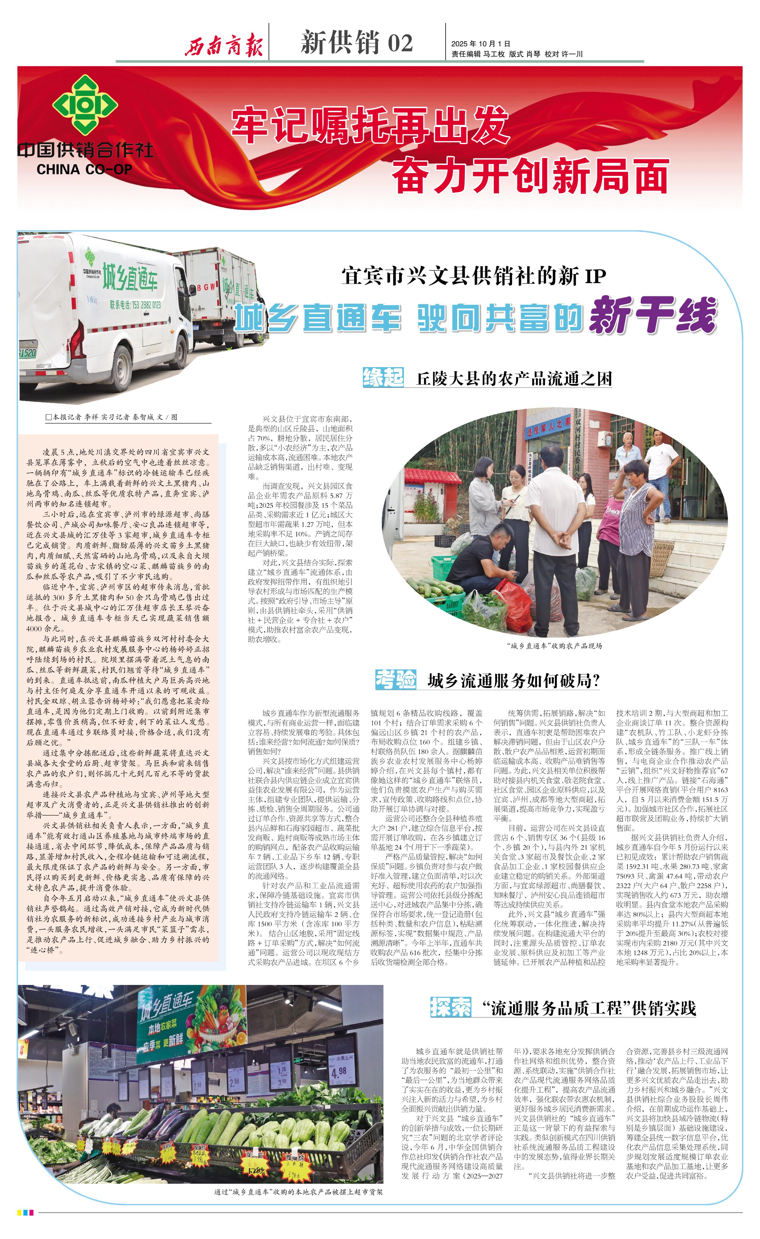 对于兴文县“城乡直通车”的创新举措与成效,一位长期研究“三农”问题的北京学者评论说,今年6月,中华全国供销合作总社印发《供销合作社农产品现代流通服务网络建设高质量发展行动方案(2025—2027年)》,要求各地充分发挥供销合作社网络和组织优势,整合资源、系统联动,实施“供销合作社农产品现代流通服务网络品质化提升工程”,提高农产品流通效率,强化联农带农惠农机制,更好服务城乡居民消费新需求。兴文县供销社的“城乡直通车”正是这一背景下的有益探索与实践。类似创新模式在四川供销社系统流通服务品质工程建设中的发展态势,值得业界长期关注。