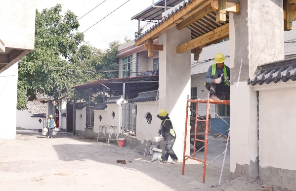 村中街道上,身着“农文旅投”工作服的工人正在粉刷新民舍的门楼与围墙。粉饰一新的墙面装饰着木质窗户,漫步青石街道,宛若行走在古镇景区。