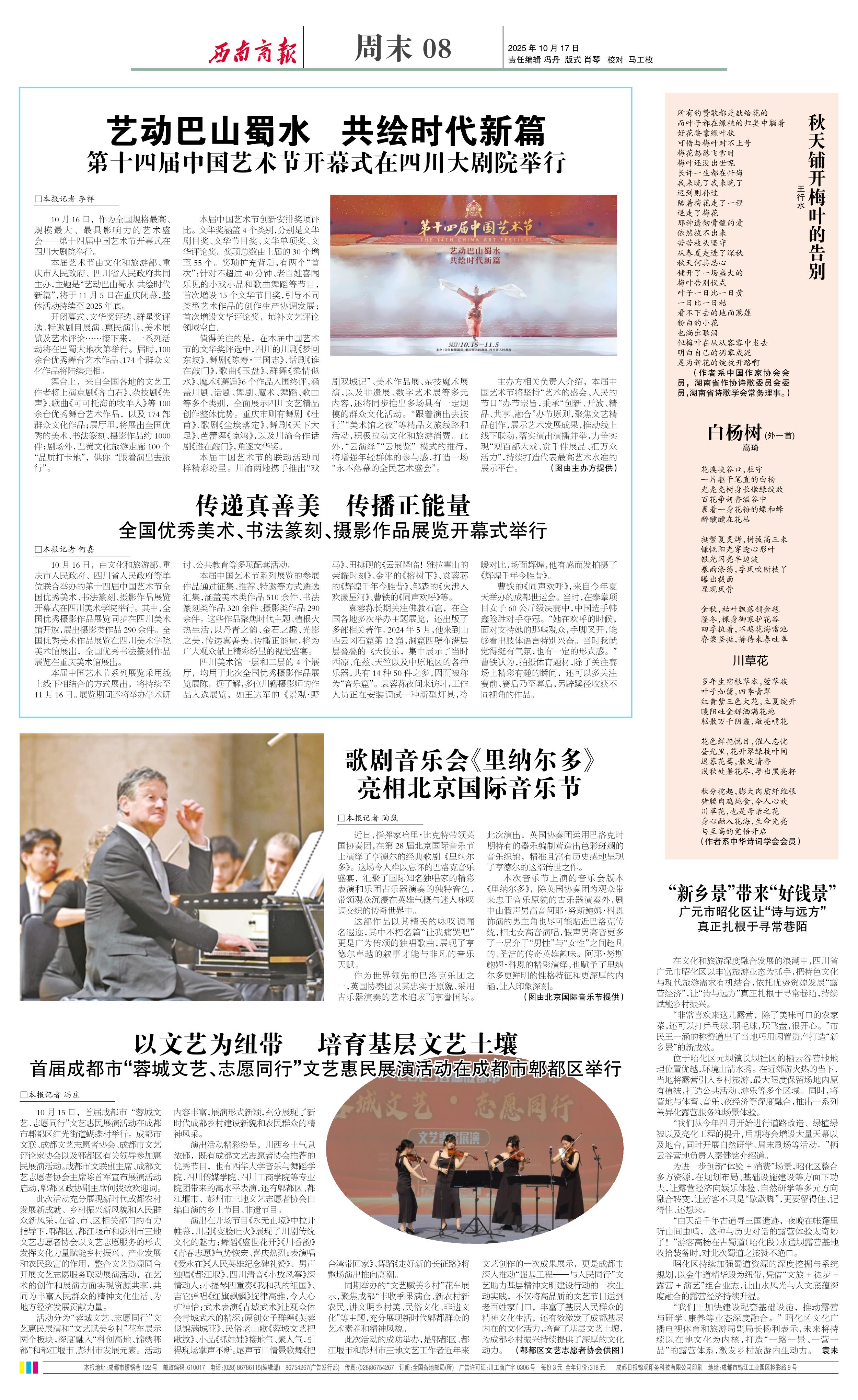 10月16日,由文化和旅游部、重庆市人民政府、四川省人民政府等单位联合举办的第十四届中国艺术节全国优秀美术、书法篆刻、摄影作品展览开幕式在四川美术学院举行。其中,全国优秀摄影作品展览同步在四川美术馆开放,展出摄影类作品290余件。全国优秀美术作品展览在四川美术学院美术馆展出,全国优秀书法篆刻作品展览在重庆美术馆展出。