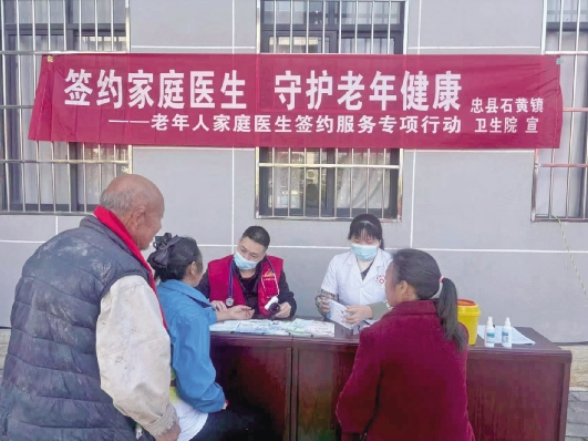 近日,重庆市忠县石黄镇卫生院组成7个专业医疗小组到全镇7个村(居)委对老年人开展家庭医生签约服务,各小组分别为老人送去了慰问品,并由医生为老人免费进行了测血压、测血糖、把脉问诊、开具处方等工作,为老年人提供了健康保障。