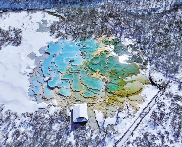深秋,黄龙景区已被白雪覆盖,银装素裹。而在这片洁白中,五彩池宛如一块巨大的翡翠,镶嵌其中,翠绿得令人心醉。池水清澈见底,钙华沉积物在阳光下闪烁五彩光芒,随光线变幻色彩。池边树木挂满冰凌,远处雪山巍峨,共同构成绝美画卷。