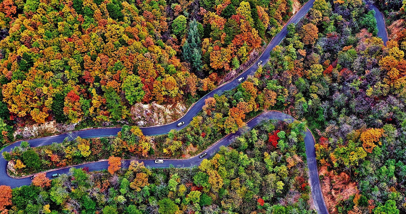11月3日,四川省巴中市南江县杨坝镇通往光雾山十八月潭旅游景区的旅游公路穿梭于山间,与沿路五彩斑斓的彩林构成一幅美丽画卷。