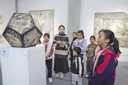 活动现场,在专业导览员的带领下,参与家庭沉浸式参观了“时空图层——中央美术学院美术馆藏毕业作品特展”。据了解,该展览以中央美术学院十年来的毕业作品收藏为主体,汇集了60余位艺术家的120余件创作精品,涵盖中国画、油画、版画、影像、装置和综合材料等多种艺术表现形式。