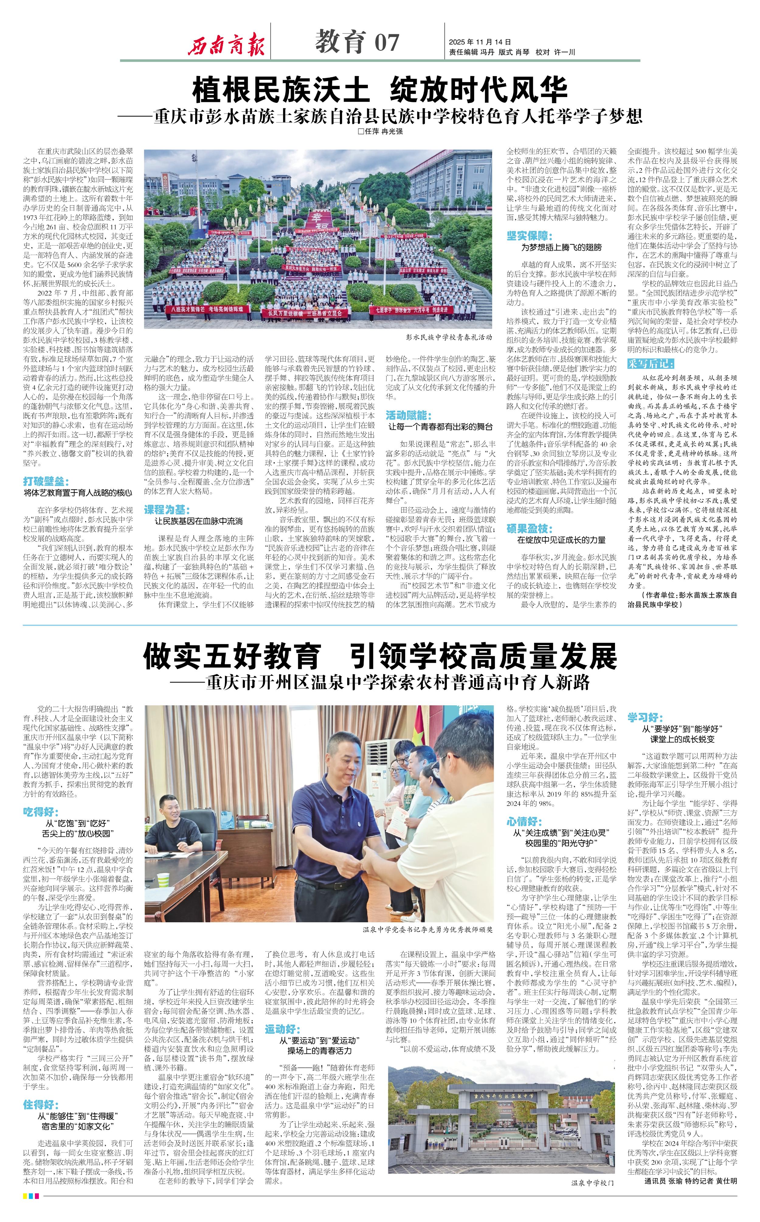 2022年7月,中组部、教育部等八部委组织实施的国家乡村振兴重点帮扶县教育人才“组团式”帮扶工作落户彭水民族中学校,让该校的发展步入了快车道。漫步今日的彭水民族中学校校园,3栋教学楼、实验楼、科技楼、图书馆等建筑错落有致,标准足球场绿草如茵,7个室外篮球场与1个室内篮球馆时刻跃动着青春的活力。然而,比这些总投资4亿余元打造的硬件设施更打动人心的,是弥漫在校园每一个角落的蓬勃朝气与浓郁文化气息。这里,既有书声琅琅,也有笙歌阵阵;既有对知识的静心求索,也有在运动场上的挥汗如雨。这一切,都源于学校对“幸福教育”理念的深刻践行,对“养兴教立、德馨文蔚”校训的执着坚守。
