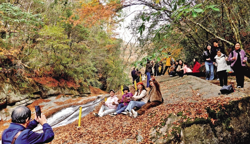 深秋初冬时节,南江县光雾山十八月潭凭借其独特的山水瀑布和红叶景观,引来众多游客观景拍照,感受原生态风光。