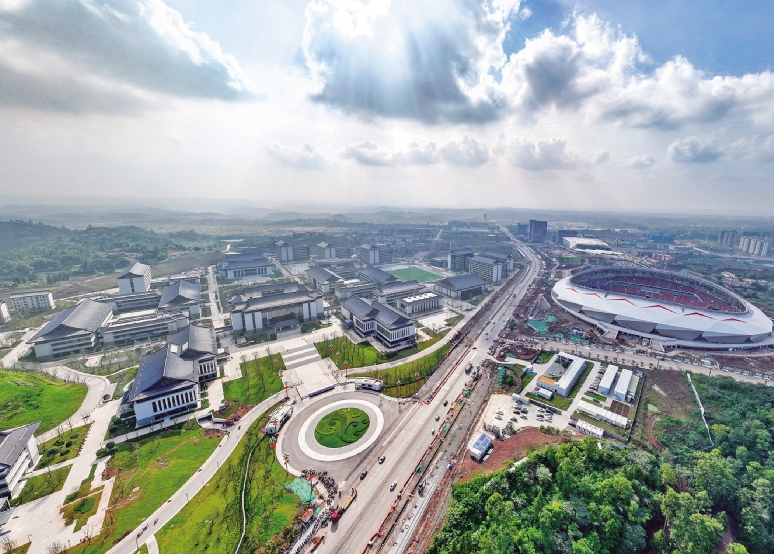 11月17日,四川省广安市官盛新区正在加紧实施收尾工程的重点项目——广安理工学院和相邻的奥体中心,在阳光的映衬下显得温馨祥和。