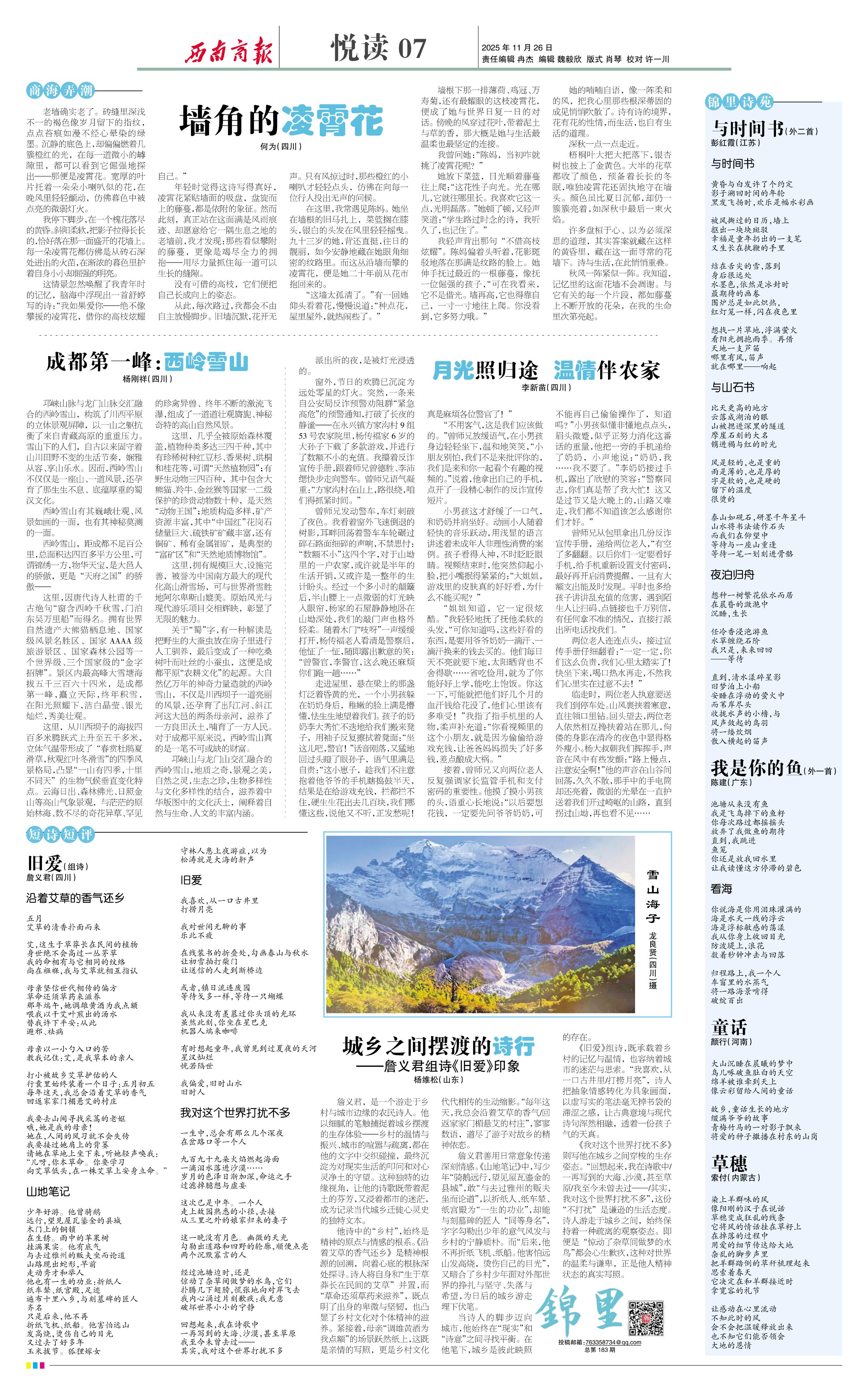 邛崃山与龙门山交汇融合的西岭雪山,地质之奇,景观之美,自然之灵,生态之珍,生物多样性与文化多样性的结合,滋养着中华版图中的文化沃土,阐释着自然与生命、人文的丰富内涵。
