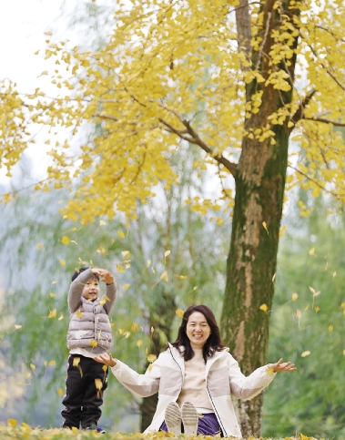12月6日,四川省乐山市新广场石榴籽家园内,银杏一片金黄,美不胜收,吸引不少市民前来游玩。