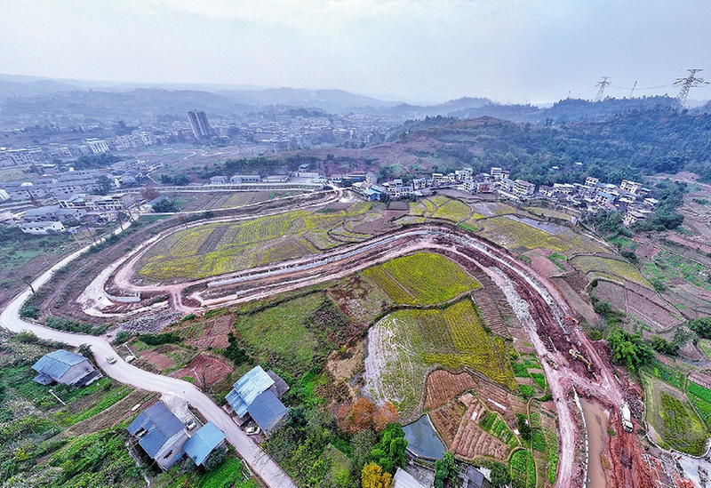 12月10日,鸟瞰四川省华蓥市庆华镇正在实施堤防(河道整治)工程的庆高河邱家嘴段。