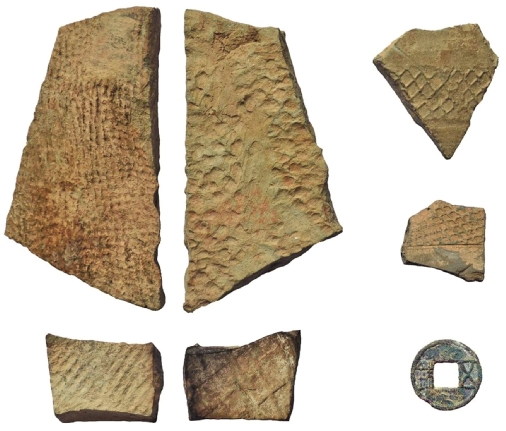 此次考古调查发现的陶瓦片、五铢钱等 □本报记者 李吉明