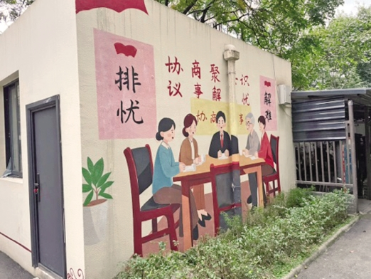 但争论并未演变成矛盾。在社工与社区“邻里调解队”的引导下,讨论焦点从“我想要什么”转向“我们共同需要什么”。最终,一位调解队居民提出的“两步走”方案成功破局:党群服务中心墙面紧扣“协商议事”主题,描绘居民共商共治的鲜活场景;停车场围墙则采用简洁明快的卡通图案,增添生活趣味。这个兼顾功能性与包容性的创意,赢得了绝大多数居民的赞同。经举手表决、结果公示后,“两步走”方案正式落地实施。
