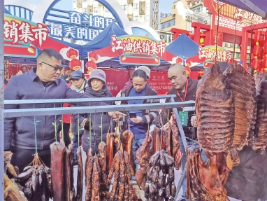 活动现场按参展地区划分独立展位,每个展位都统一设计,融入当地文化元素与新年装饰,既整齐规范又各具特色。参展产品涵盖地方特色农产品、地理标志产品、老字号食品等,重点突出年货属性。记者在现场看到,河口镇的富硒柚子、西屏镇的跑山土鸡、厚坝镇的风干鹅、安州区的佛手柑和猕猴桃、梓潼县的片粉与酥饼、北川县的香肠腊肉及蓝莓果干等应有尽有,充分展现了绵阳各地的农业特色与产业优势。