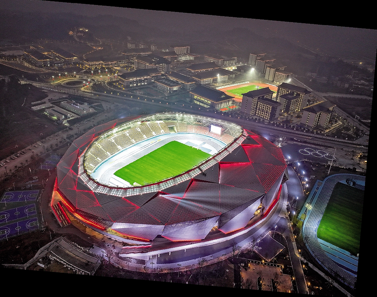 1月18日晚,位于四川省广安市广安区官盛新区的川渝广安共享体育基地工程(广安奥体中心),灯火璀璨、流光溢彩,宛如一个巨大鸟巢在夜幕中熠熠生辉。