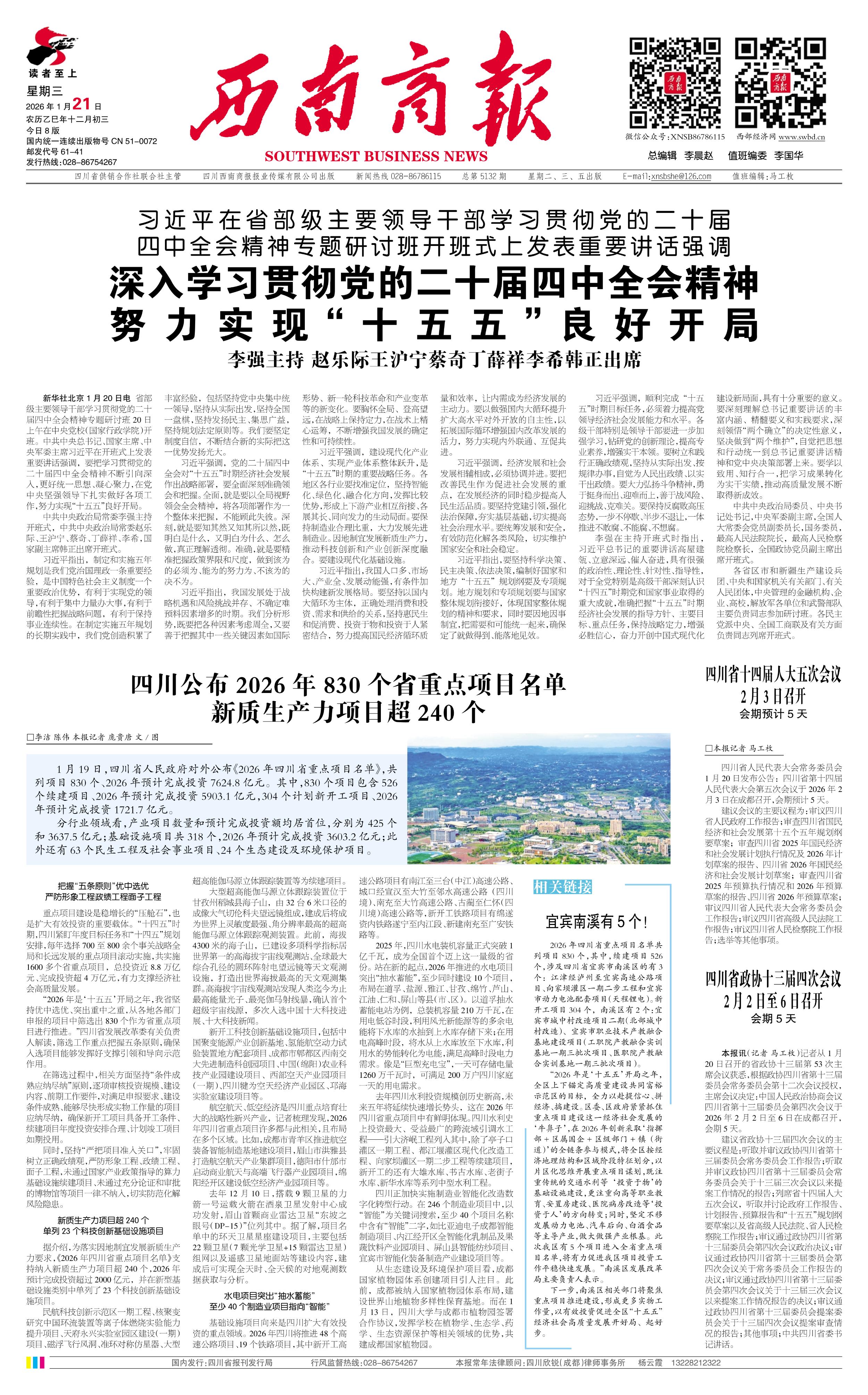 四川省政协十三届四次会议2月2日至6日召开
