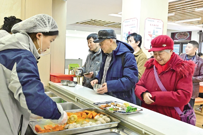 1月20日,老人们在四川省广安市广安区居家和社区嵌入式养老服务中心食堂排队领取午餐。