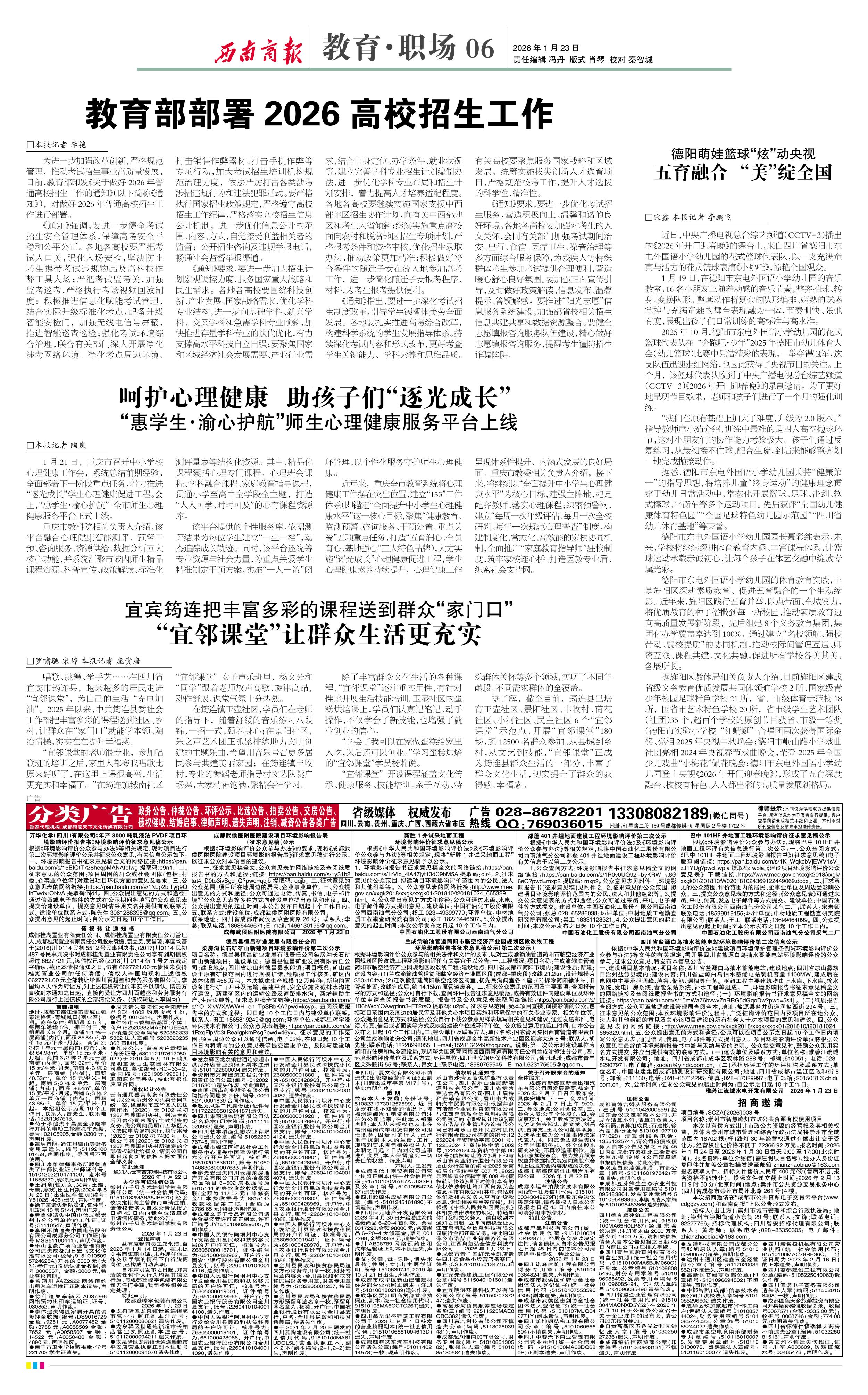 据旌阳区教体局相关负责人介绍,目前旌阳区建成省级义务教育优质发展共同体领航学校2所,国家级青少年校园足球特色学校21所,省、市级体育示范校18所,国省市艺术特色学校20所,省市级学生艺术团队(社团)35个,超百个学校的原创节目获省、市级一等奖(德阳市实验小学校“红蜻蜓”合唱团两次获得国际金奖、亮相2025年央视中秋晚会;德阳市岷山路小学戏曲社团亮相2024年央视春节戏曲晚会,荣登2025年全国少儿戏曲“小梅花”佩花晚会;德阳市东电外国语小学幼儿园登上央视《2026年开门迎春晚》),形成了五育深度融合、校校有特色、人人都出彩的高质量发展新格局。