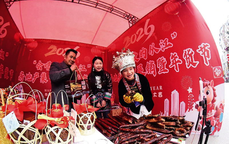 春节临近,贵州省黔东南苗族侗族自治州从江县举办新春市集,邀请电商主持人线上直播,推介销售腊肉、香肠和银饰等特色年货,激活年味经济,助力农户增收。
