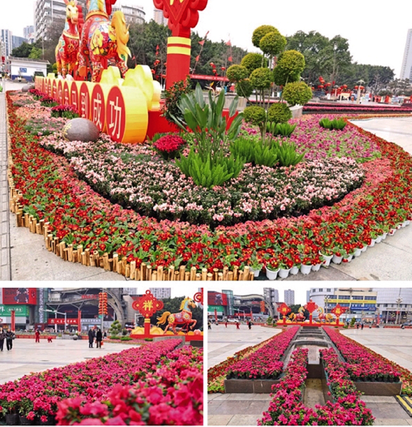 墙面月季雕塑以玻璃钢材质打造,立体花型与立面绿植、地面花卉相互呼应,强化了城市文化识别度,成为通勤路上耐看的街头风景。长江路、庐山路等主要道路,以罗汉松、冬青搭配杜鹃、角堇等12万余盆常绿植物与时令花卉科学组合为花箱,串联起全城节日氛围,让年味持续生长,让美好融入日常。