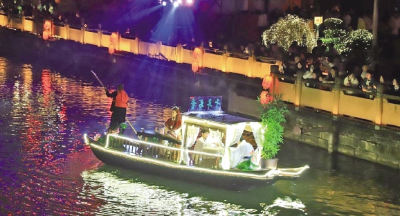 本次巡游深耕本土传统文化,创新打造水陆联动的展演形式,将传统渔船灯彩、民俗方阵、汉服礼乐等特色元素巧妙融合。夜幕之下,流光溢彩的彩灯沿河铺展,与古街的亭台楼阁相映成趣,勾勒出一幅美轮美奂的新春夜景。