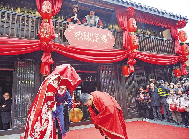 当天14时,备受期待的《崇州囍事》抛绣球互动演出准时开场。绣楼之上,姑娘手持绣球,眼波流转,楼下人群仰头张望,摩拳擦掌。绣球一抛,众人争相伸手,最终一位年轻人稳稳接住,被簇拥着登楼“成亲”,现场爆发出阵阵欢笑声。