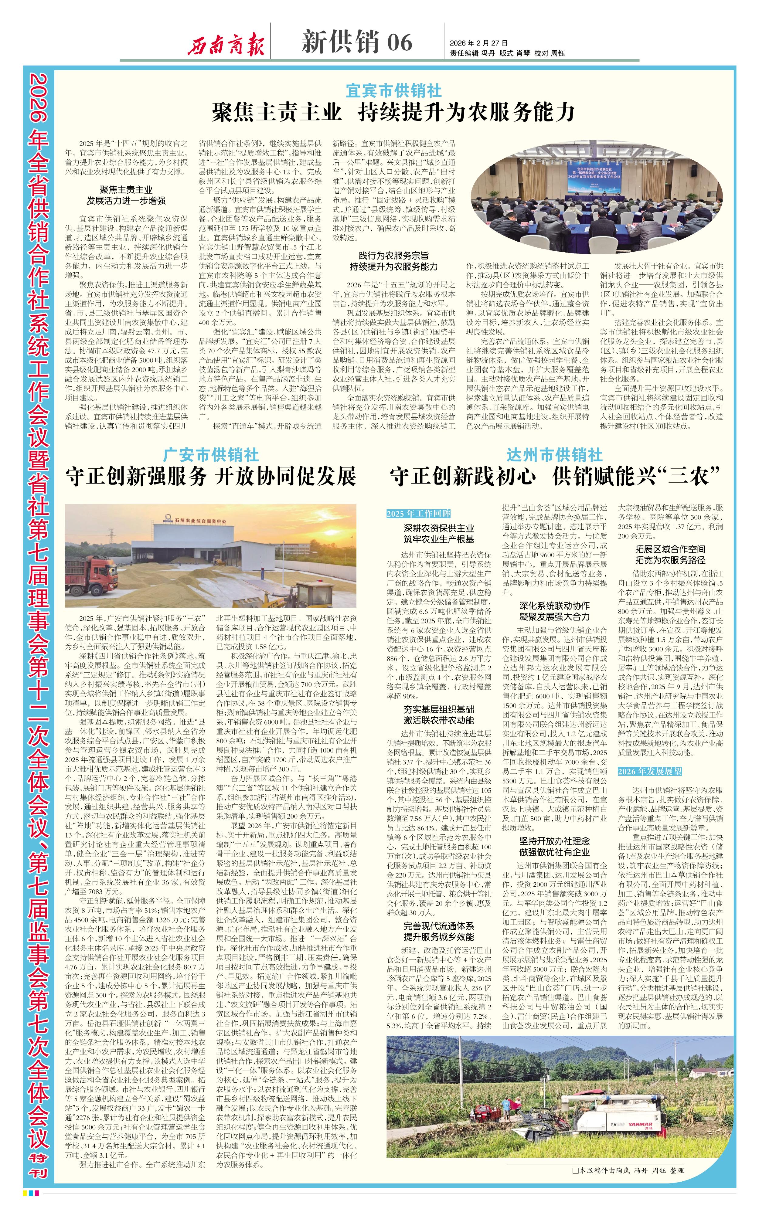 展望2026年,广安市供销社将锚定新目标、实干开新局,重点抓好四大任务。高质量编制“十五五”发展规划。谋划重点项目、培育骨干企业、建设一批服务功能完备、利益联结紧密的基层供销社示范社,基层社示范社、总结新经验,全面提升供销合作事业高质量发展成色。启动“两改两融”工作。深化基层社改革融入,指导县级社协同乡镇(街道)细化供销工作履职流程,明确工作规范,推动基层社融入基层治理体系和群众生产生活。深化社企改革融入,组建市社集团公司,整合资源、优化布局,推动社有企业融入地方产业发展和全国统一大市场。推进“一深双拓”合作。深化社市合作成效,加快推进社市合作重点项目建设,严格倒排工期、压实责任,确保项目按时间节点高效推进,力争早建成、早投产、早见效。拓宽渝广合作领域,紧扣川渝毗邻地区产业协同发展战略,加强与重庆市供销社系统对接,重点推进农产品产销基地共建、“农文旅研”融合项目开发等合作事项。拓宽区域合作市场,加强与浙江省湖州市供销社合作,巩固拓展消费扶贫成果;与上海市嘉定区供销社合作,扩大农副产品销售种类和规模;与安徽省黄山市供销社合作,打通农产品跨区域流通通道;与黑龙江省鹤岗市等地供销社合作,探索农产品出口外销新模式。建设“三化一体”服务体系。以农业社会化服务为核心,延伸“全链条、一站式”服务,提升为农服务水平;以农村流通现代化为支撑,完善市县乡村四级物流配送网络,推动线上线下融合发展;以农民合作专业化为基础,完善联农带农机制,探索助农富农新模式,提升农民组织化程度;健全再生资源回收利用体系,优化回收网点布局,提升资源循环利用效率,加快构建“农业服务社会化、农村流通现代化、农民合作专业化+再生回收利用”的一体化为农服务体系。