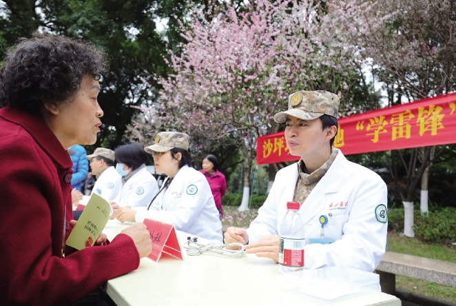 当日,沙坪坝区退役军人事务局联合陆军军医大学第二附属医院(新桥医院)开展“学雷锋精神谱双拥新篇”惠民义诊活动。活动现场,医院的胸外科专家以通俗易懂的语言,为群众带来了一场实用的健康知识讲座。与此同时,医院的医护人员与军休干部组成的“红岩老兵志愿服务队”为前来咨询的群众提供免费集中义诊,耐心解答大家关于健康养生、疾病治疗的疑问,让群众在家门口就能享受到专业的医疗服务。