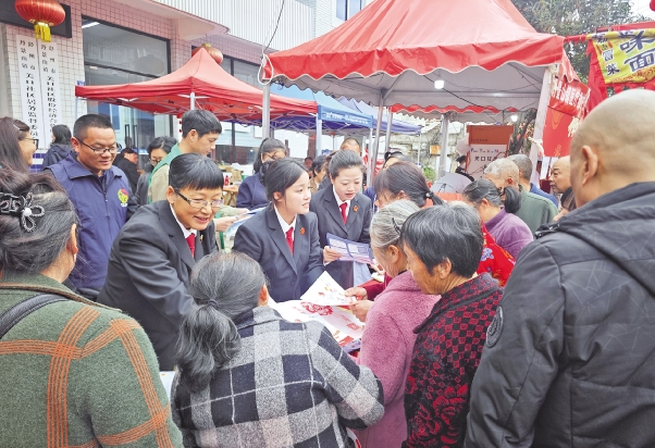 法院干警现场发放普法宣传资料并解答群众法律咨询 “赶集还能学到法律知识,不光听得懂,还用得上,这个‘法治新春年货’很实在!”村民赵大姐笑着说。