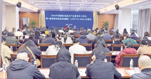 为进一步加强食品安全监管,规范食品生产经营行为,压紧压实企业主体责任,3月 10日,四川省德阳市旌阳区市场监督管理局组织召开2026年食品生产企业安全工作会暨《预包装食品标签通则》(GB7718-2025)宣贯会议,食品生产股、各市场监管所食品安全监管人员及全区110家食品生产企业负责人参加会议。
