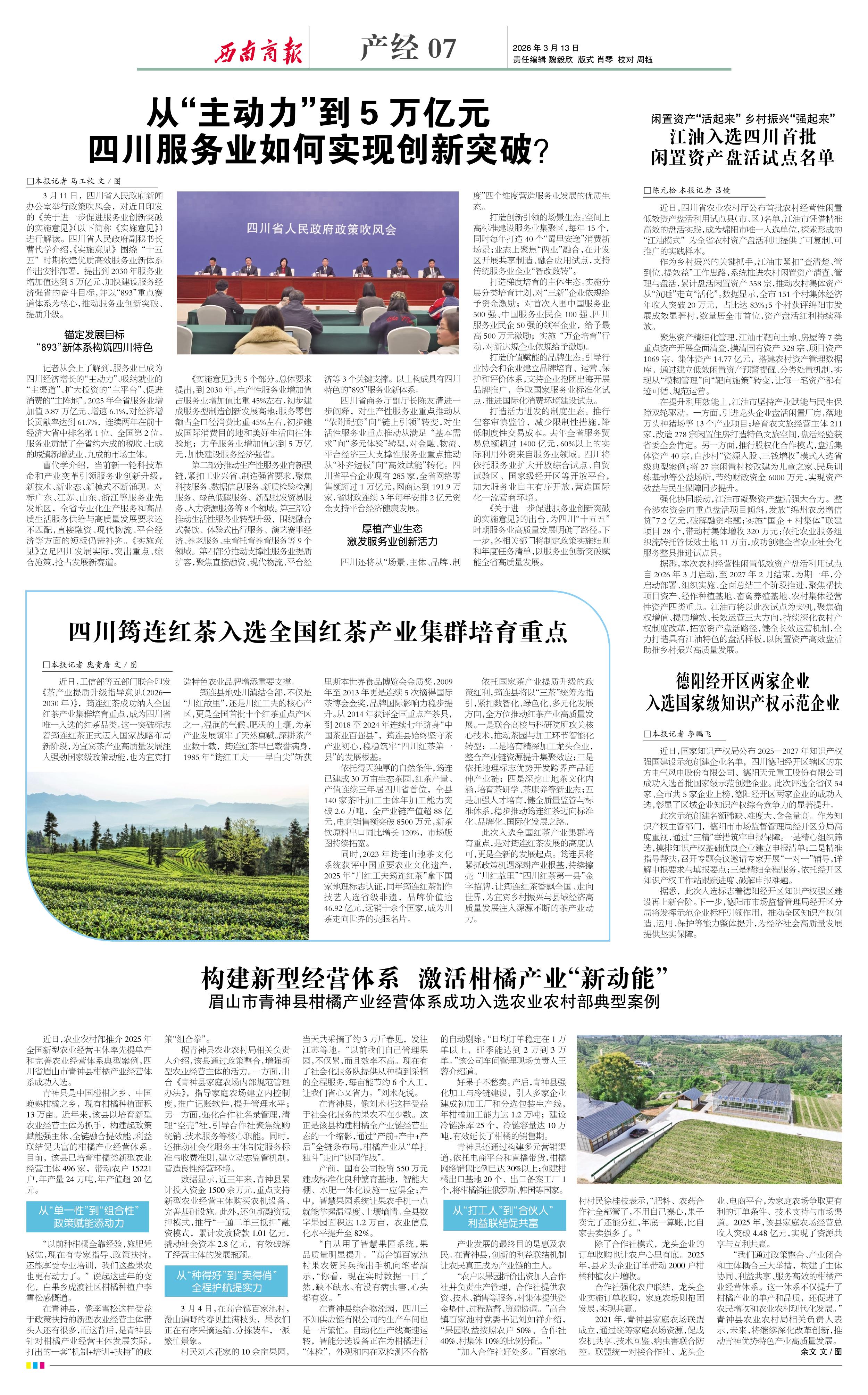 强化协同联动,江油市凝聚资产盘活强大合力。整合涉农资金向重点盘活项目倾斜,发放“绵州农房增信贷”7.2亿元,破解融资难题;实施“国企+村集体”联建项目28个,带动村集体增收320万元;依托农业服务组织流转托管低效土地11万亩,成功创建全省农业社会化服务整县推进试点县。