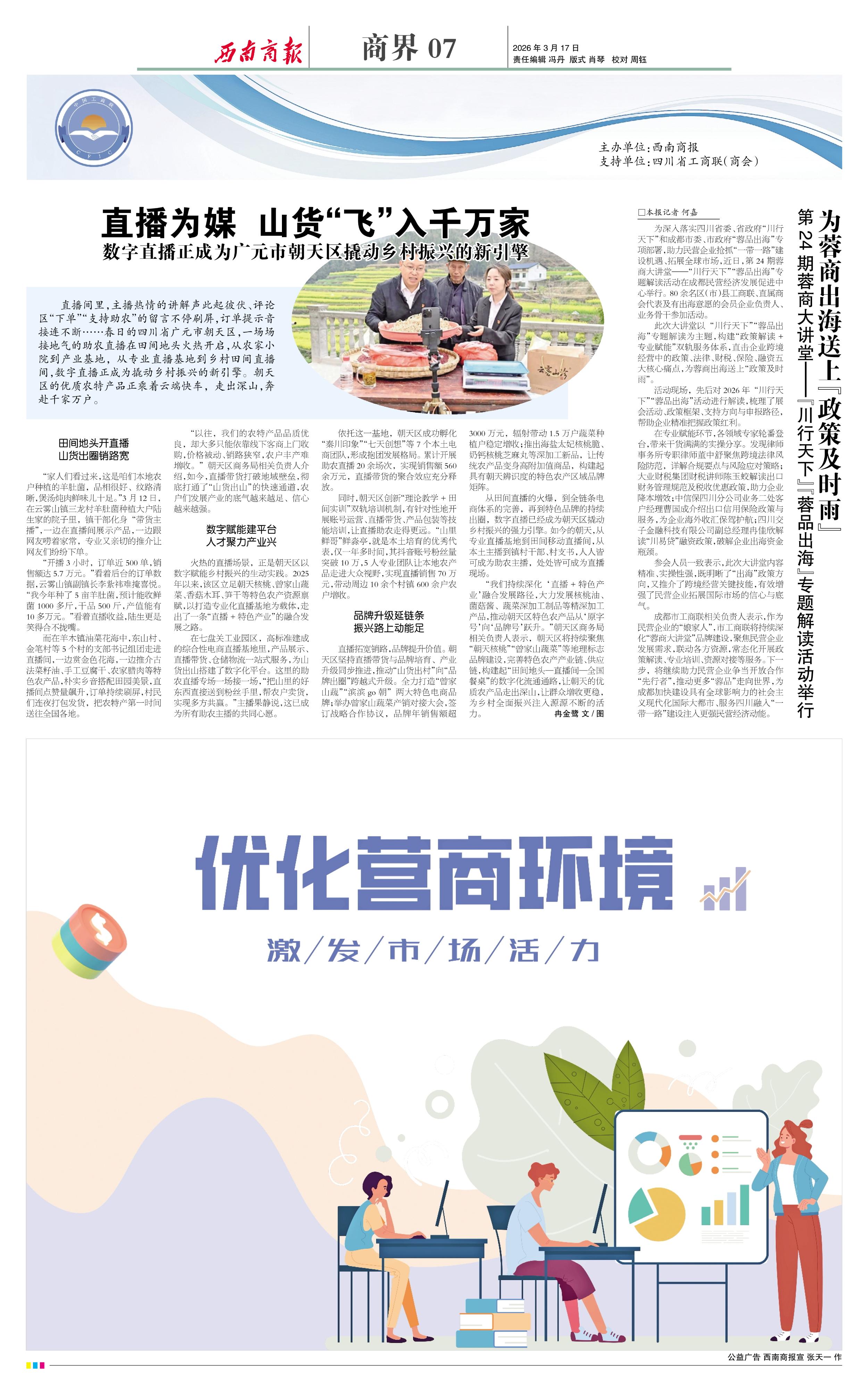 “我们持续深化‘直播+特色产业’融合发展路径,大力发展核桃油、菌菇酱、蔬菜深加工制品等精深加工产品,推动朝天区特色农产品从‘原字号’向‘品牌号’跃升。”朝天区商务局相关负责人表示,朝天区将持续聚焦“朝天核桃”“曾家山蔬菜”等地理标志品牌建设,完善特色农产产业链、供应链,构建起“田间地头—直播间—全国餐桌”的数字化流通通路,让朝天的优质农产品走出深山,让群众增收更稳,为乡村全面振兴注入源源不断的活力。