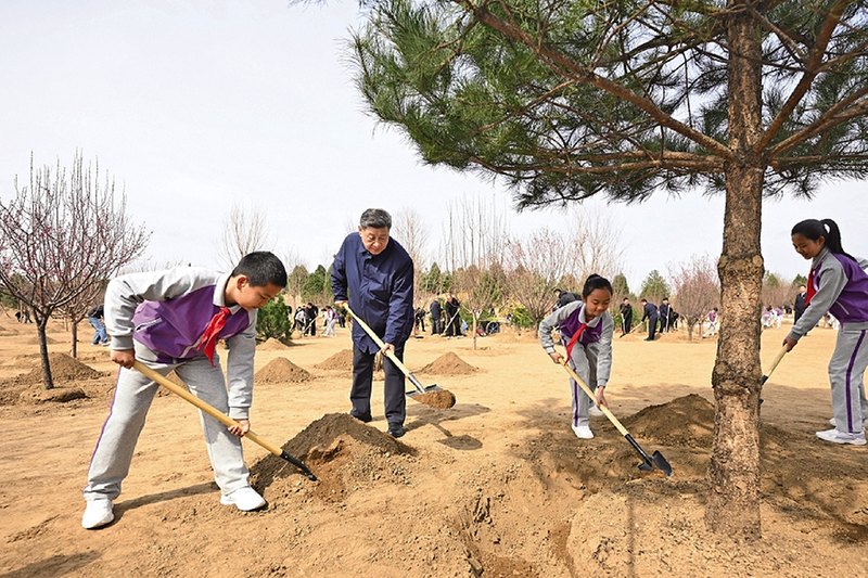 3月30日,党和国家领导人习近平、李强、赵乐际、王沪宁、蔡奇、丁薛祥、李希等来到北京市昌平区百善镇参加首都义务植树活动。这是习近平同大家一起植树。 新华社记者 燕雁 摄 新华社北京3月30日电 中共中央总书记、国家主席、中央军委主席习近平30日上午在参加首都义务植树活动时强调,良好生态人人共享,也需要合力共建。要组织动员全社会广泛参与植树造林,为山川大地增添锦绣,让中国式现代化的底色更加亮丽。