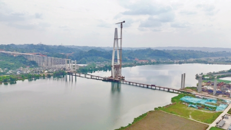 3月30日,汉阳岷江特大桥建设现场,大型机械设备轰鸣运转,工人们正紧张有序地进行主梁施工作业。