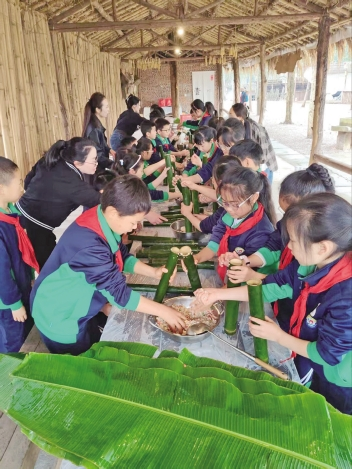 竹筒藏米香,烟火觅春光。二年级的同学们与春日撞个满怀,在郊野林间体验独具特色的竹筒饭制作。在大人的指导下,孩子们亲手将晶莹的糯米装填进青翠的竹筒,静待烟火慢煨。微风拂过,竹香与米香交织飘散,清甜的香气萦绕鼻尖。他们在动手劳作中感受烟火气息,在耐心等待里品味春日馈赠,灿烂的笑脸与春光相映成趣。