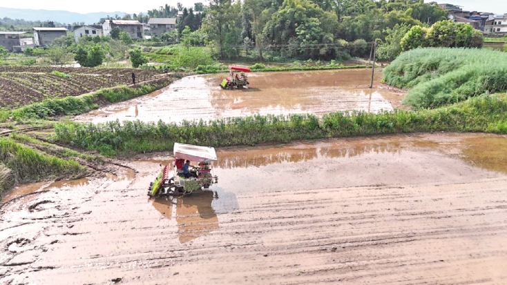 近日,四川省广安市邻水县袁市镇金堂村,春阳和煦。“准备——放苗!”农机手一声短促指令,两名辅助工随即弯腰将一盘盘秧苗整齐码上输送带。紧接着,“哒”的一声轻响,插秧机平稳入田,身后留下一行行翠绿的直线。
