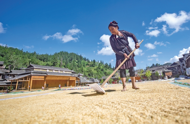 9月17日,贵州省从江县高增乡小黄侗寨村民在广场上晾晒稻谷。