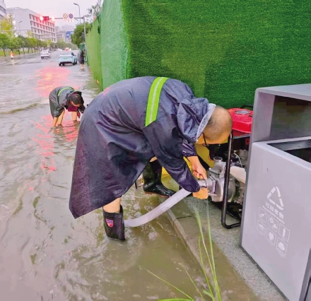 险情就是命令。碳汇二期项目部密切关注天气变化及现场情况,在发现校园周边积水险情后,立即启动防汛应急响应,迅速组织党员突击队,调配4台大功率抽水泵及安全警示设施等设备物资,第一时间奔赴现场开展抽排水作业。