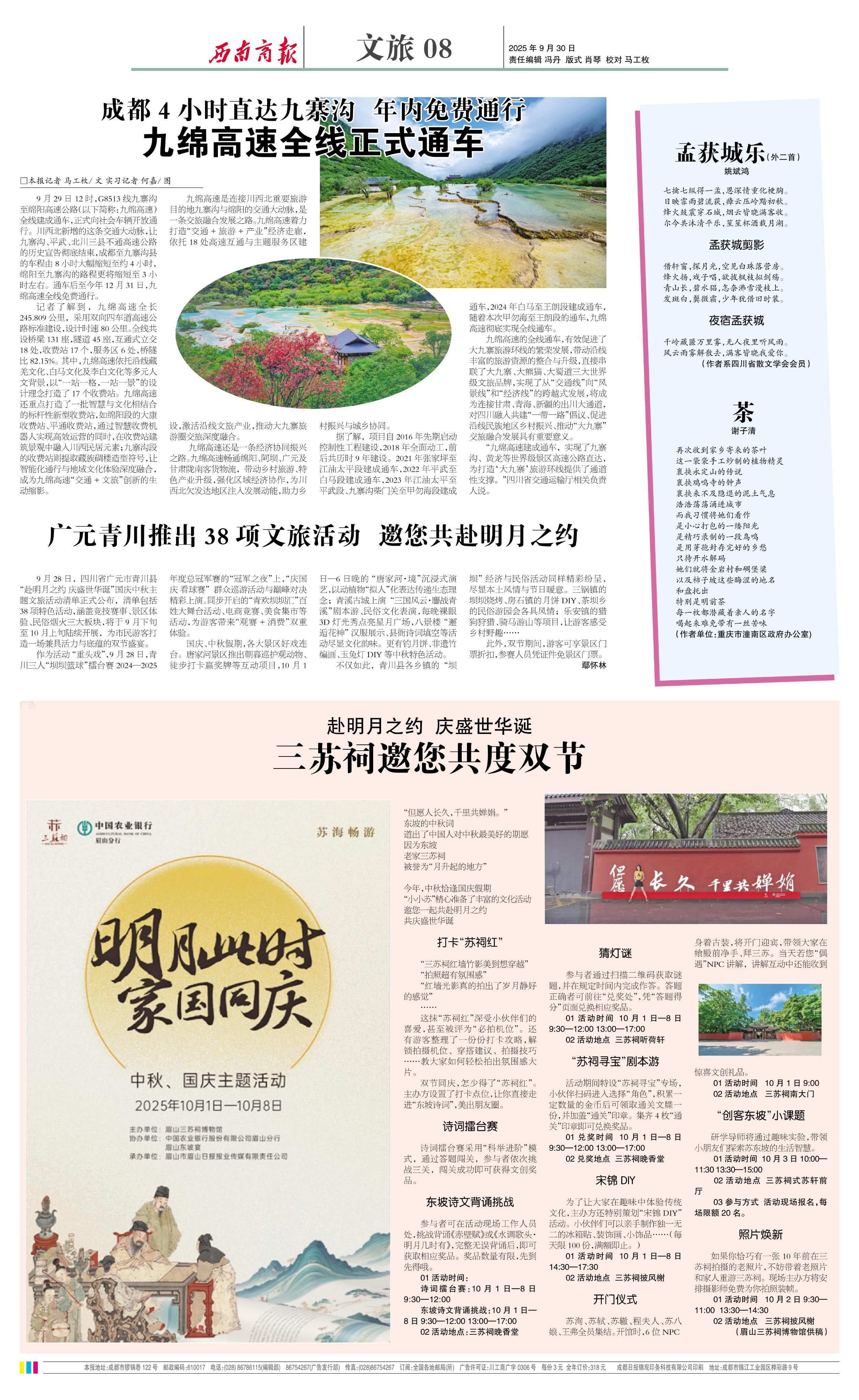 “九绵高速建成通车,实现了九寨沟、黄龙等世界级景区高速公路直达,为打造‘大九寨’旅游环线提供了通道性支撑。”四川省交通运输厅相关负责人说。