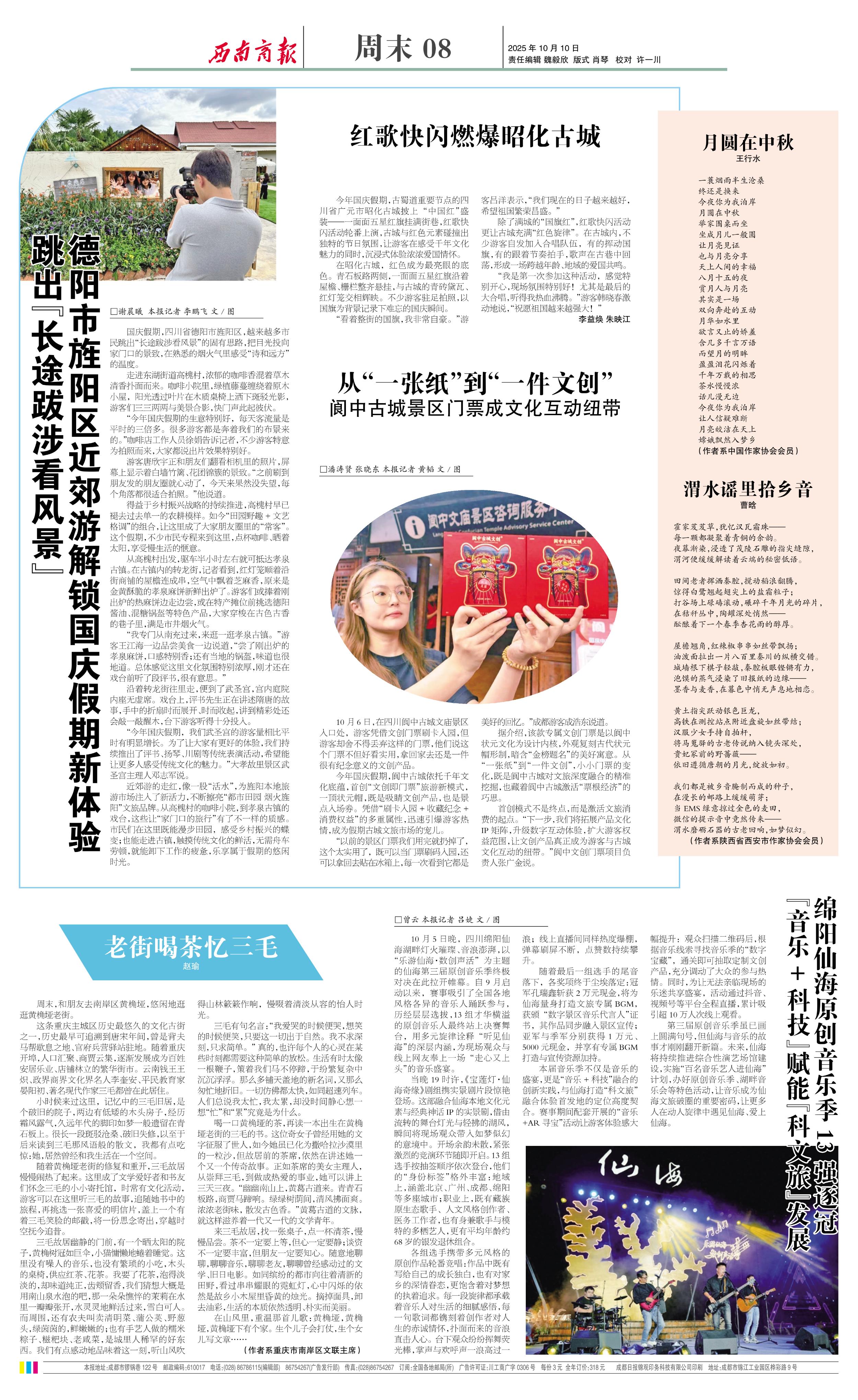 今年国庆假期,古蜀道重要节点的四川省广元市昭化古城披上“中国红”盛装——一面面五星红旗挂满街巷,红歌快闪活动轮番上演,古城与红色元素碰撞出独特的节日氛围,让游客在感受千年文化魅力的同时,沉浸式体验浓浓爱国情怀。