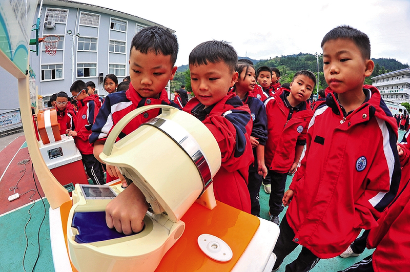 10月22日,贵州省黔东南苗族侗族自治州从江县城关第四小学的学生在体验科普展品。