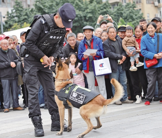 活动开场,2只警犬依次完成坐卧跳跃、搜爆演示等技能展示,紧随其后的机器狗则踩着音乐节拍扭动身躯,引得现场掌声、欢呼声不断。“妈妈快看,那只狗好厉害,一下子就跳起来了。”一位小朋友拉着妈妈的手,眼睛紧紧盯着警犬,兴奋地喊道。