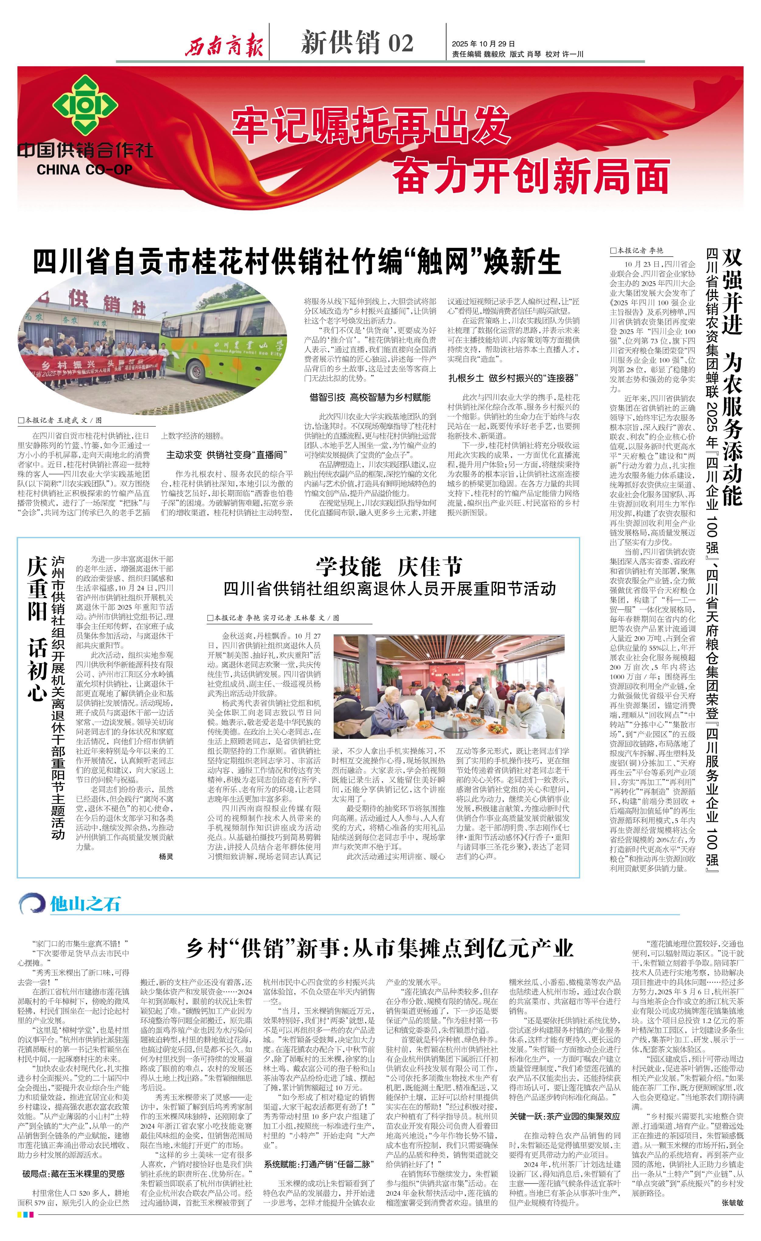 当前,四川省供销农资集团深入落实省委、省政府和省供销社有关部署,聚焦农资农服全产业链,全力做强做优省级平台天府粮仓集团,构建了“科—工—贸—服”一体化发展格局,每年春耕期间在省内的化肥等农资产品累计流通调入量近200万吨、占到全省总供应量的55%以上,年开展农业社会化服务规模超200 万亩次,5 年内将达1000万亩/年;围绕再生资源回收利用全产业链,全力做强做优省级平台天府再生资源集团,锚定消费端,理顺从“回收网点”“中转站”“分拣中心”“集散市场”,到“产业园区”的五级资源回收链路,布局落地了报废汽车拆解、再生塑料及废铝(铜)分拣加工、“天府再生云”平台等系列产业项目,夯实“再加工”“再利用”“再转化”“再制造”资源循环,构建“前端分类回收+后端高附加值延伸”的再生资源循环利用模式,5年内再生资源经营规模将达全省经营规模的20%左右,为打造新时代更高水平“天府粮仓”和推动再生资源回收利用贡献更多供销力量。