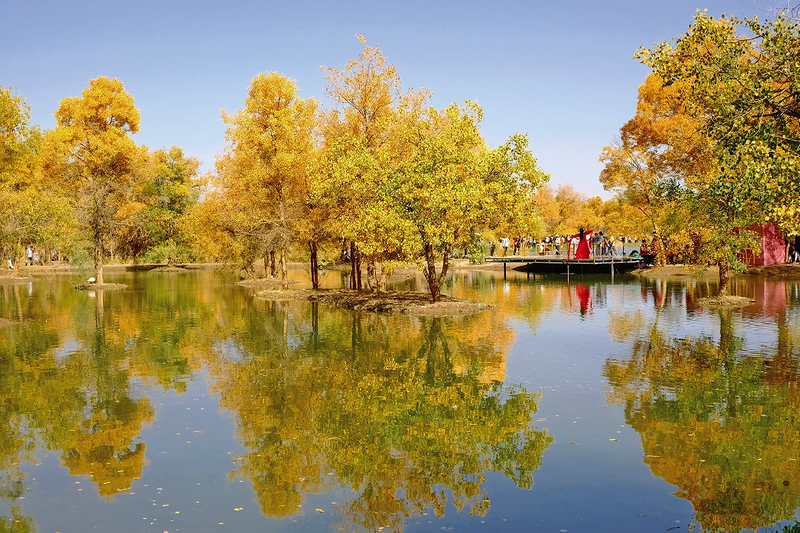 这片胡杨林不仅好看,更藏着生命的韧劲。它们扎根在盐碱地中,经历风沙洗礼,有的树干虽已盘虬,却依然枝叶繁茂。林区里的人工湖更是点睛之笔,金黄的胡杨倒映在水中,水天一色,随手一拍都是美景。